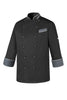 Chef jacket with gray band and extractable buttons. 65% cotton and 35% polyester. Available in different sizes in BLACK.