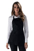 Apron CLIO, with ring fastening, double pocket and fabric laces. 100% polyester, available in pinstripe black and pinstripe brown.